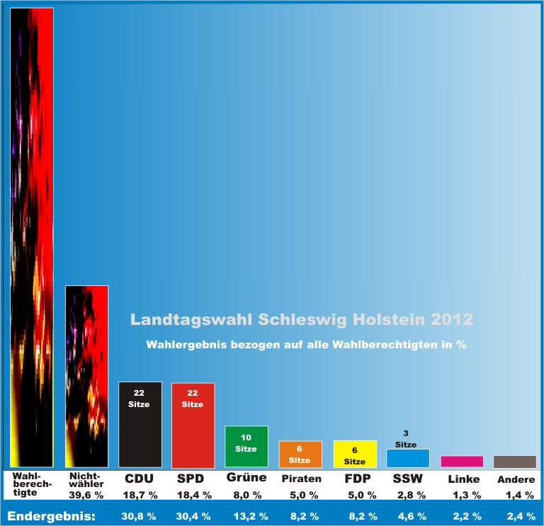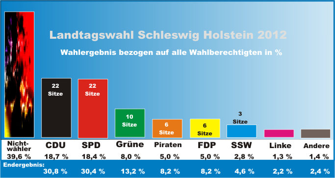 ![]() 07.05.2012 02:00 Landtagswahl in Schleswig-Holstein bringt unklare Machtverhältnisse, Schwarz-Gelb abgewählt Kiehl - Die Landtagswahl hat unklare Machtverhältnisse in Schleswig-Holstein gebracht. Die bisher regierende CDU landete mit 22 Sitzen gleichauf mit der oppositionellen SPD. Die Grünen haben Stimmen gewonnen und sind drittstärkste Partei vor den Piraten und SSW geworden. Die FDP hat es trotz hoher Einbußen wieder in den Landtag geschafft. Die Linke ist deutlich an der 5%-Klausel gescheitert. Die Wahlbeteiligung lag bei nur 60%. JWD Die SPD strebt eine «Dänen-Ampel» mit SSW und den Grünen an Es reicht weder für Schwarz-Gelb noch für Rot-Grün. Als wahrscheinlichste Koalition zeichnet sich ein Bündnis aus SPD, Grünen und Südschleswigschem Wählerverband - die «Dänen-Ampel» - ab. Diese hat aber nur eine riskante Ein-Stimmen-Mehrheit. Die Piraten setzten ihren Siegeszug fort. Die Nichtwähler stellen die mit Abstand größte Gruppe dar. ![]() ![]() Eigene Grafik Wo sind, bzw. wie erkennt man denn eigentlich Volksparteien? ![]() ![]()
