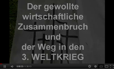 ![]() 03.08.2012 11:55 INVESTIGATIV JOURNAL: Der gewollte Zusammenbruch... Der freie Journalist und Synchronsprecher Andy Franke und das Investigativ Journal in Zusammenarbeit mit C.Freund gewähren in dieser angsteinflößenden Dokumentation einen tiefen Einblick, in die Weltpolitik und vor allem zeigen sie „die wahren Machthaber" hinter den Politikern und deren "mörderischen Pläne"! Dabei werden zutiefst schockierende Fakten zutage gefördert, die ihnen erschreckende und schonungslose Einblicke in die mafiaähnlichen Strukturen dieser kriegsverbrecherischen, selbsternannten Elite ermöglichen. [Quelle: youtube.com] JWD [Auszug aus dem Begleittext zum Video vom 27.3.2012] Zu dieser Vereinigung zählen unter anderem mächtige Banker, Politiker, Großindustrielle und Monarchen. Sie werden mehr als zutiefst schockiert sein, welche Personen zu genau dieser Vereinigung gehören. Darüber hinaus wird sehr deutlich veranschaulicht, dass es in den gesamten westlichen Ländern faktisch kaum noch „Politische Pressefreiheit" gibt. Es wird anhand von Fakten verdeutlicht, dass die „westlichen Medien" von der Politik zur Propagandamaschine degradiert wurden, wie einst „Die aktuelle Kamera" „Der schwarze Kanal" und/oder die Wochenschau... oder Ähnliche Öffentliche Nachrichtensendungen dienen zumeist nur noch dem Ziel, bewusste und gezielt; Wahrheiten zu unterdrücken, Unwahrheiten zu verbreiten... nicht nur ,um Meinungsbeeinflussung zu betreiben sondern um mitunter sogar „Pro-Kriegsstimmung" bei den Zuschauern hervorzurufen. [..] [Auszug Ende] Link zum Video auf Youtube