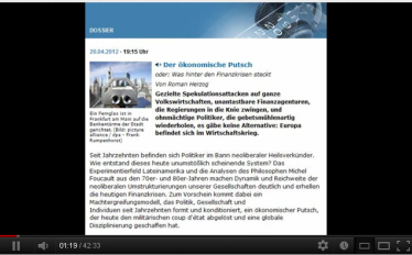 ![]() 03.09.2012 14:15 Wirtschaftskrieg - wird die Demokratie abgeschafft? Der Dokumentarautor Roman Herzog untersucht in seiner 42minütigen Dokumentation - "Der ökonomische Putsch" - die Frage, wie das scheinbar unumstößliche, auf ganzer Linie versagende System des Neoliberalismus entstanden ist und wer daran interessiert ist, dieses System immer weiter zu stützen. JWD [Auszug aus dem Sendungshinweis / Quelle: Deutschlandfunk]: Was hinter den Finanzkrisen steckt [..] Gezielte Spekulationsattacken auf ganze Volkswirtschaften, unantastbare Finanzagenturen, die Regierungen in die Knie zwingen, und ohnmächtige Politiker, die gebetsmühlenartig wiederholen, es gäbe keine Alternative: Europa befindet sich im Wirtschaftskrieg. Seit Jahrzehnten befinden sich Politiker im Bann neoliberaler Heilsverkünder. [..] Zum Vorschein kommt dabei ein Machtergreifungsmodell, das Politik, Gesellschaft und Individuen seit Jahrzehnten formt und konditioniert, ein ökonomischer Putsch, der heute den militärischen coup d'état abgelöst und eine globale Disziplinierung geschaffen hat. [Ende Auszug] Krise der Demokratie? Statement des Münchner Juraprofessors und Experte für Wirtschaftskriminalität Bernd Schünemann: [Auszug / Audio]: Wir haben ja seit einigen Jahren das Schlagwort Postdemokratie, die Steuerung des politischen Systems durch den Finanzmarkt und damit die Abschaffung von, die faktische Abschaffung von Demokratie. [..] Und man sieht auch schon, wie sozusagen die Regierungen von den Finanzakteuren vor sich hergetrieben werden. [..] Und offenbar begreift in unseren Herrschaftskonglomeraten in Deutschland und Europa niemand, dass das an die Fundamente unserer parlamentarischen Demokratie rührt, so wie wir sie aus dem totalen also Zusammenbruch und Untergang eigentlich ja in den 50er Jahren aufgebaut haben. [Auszug Ende]: Wie tiefgreifend die Umwälzungen in den Gesellschaften sein sollen, wird deutlich am Wirken der Chicagoboys unter Anleitung von Milton Friedmann, die Lateinamerika in den letzten Jahrzehnten des vergangenen Jahrhundert als Experimentierfeld benutzten, um mittels Schockstrategie an den dortigen Staaten die Machtergreifung des Neoliberalismus als Herrschaftsmodell zu testen. Alle Institutionen der Gesellschaft werden umformt, die Wirtschaft erhält alle Freiheiten und wird undurchschaubar gemacht. Gemeinwohl darf nicht angestrebt werden. Das System des freien Wettbewerbs setzt Ungleichheit der Menschen voraus, die weiter vertieft werden muss, denn Neoliberalismus ist ein Spiel zwischen Ungleichheiten, bei dem ganz wenige gewinnen und viele verlieren. [Zitat]: Zum Vorschein kommt dabei ein Machtergreifungsmodell, das Politik, Gesellschaft und Individuen seit Jahrzehnten formt und konditioniert, ein ökonomischer Putsch. Juristen sprechen von organisierter Kriminalität und von der Mittäterschaft der Politik. [Zitat Ende] Link zu dradio.de