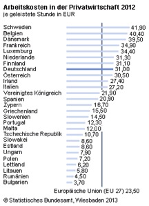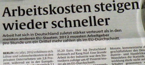 Noch ist die Schockstarre in Sachen Zypernkrise nicht überwunden, da läuft schon die nächste neoliberale Angriffswelle auf Sozialstaatlichkeit. Befördert durch die aktuelle Veröffentlichung von Daten durch das Statistische Bundesamt in Wiesbaden, die eine Steigerung der Arbeitskosten von 2,8% ausweisen und damit den EU-Durchschnitt um 0,7% übertreffen. Obwohl die Bundesrepublik gleichwohl vom 7. auf den 8. Platz im Arbeitskostenranking gefallen ist, wird die Angst vor schwindender Wettbewerbsfähigkeit geschürt.  JWD