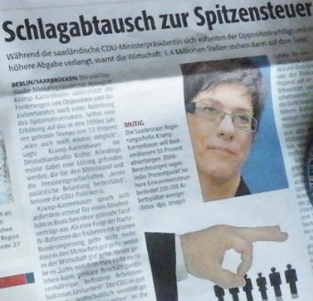 Die saarländische CDU-Ministerpräsidentin, so wird gemeldet, setze sich für einen Spitzensteuersatz von 53% (wie in Kohl's Zeiten) ein. Oh wie böse! Hochintelligent und kompetent kommt sie auf dem Foto auch nicht gerade rüber. Die Wirtschaft warnt: 1,4 Millionen Stellen stehen auf dem Spiel. Und " Schnipp ", im Bild wird's deutlich, gleich ist Eine/Einer weg. - Geht's noch?