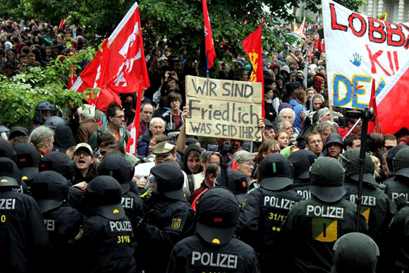 Doch das scherte das Innenministerium und die Polizei einen Dreck! Offen und unverhohlen wurden die Urteile missachtet. Die Demonstrationen am Freitag im Flughafen wurden durch Polizeimacht unterbunden, in der Innenstadt gab es bei kleineren Aktionen jede Menge Polizeirepression. Und dann kam der Samstag. Und mit ihm die zig Tausenden aus ganz Europa und ganz Deutschland, die sich auf dem Basler Platz versammelten und gemeinsam ihrem Unmut - je nach politischer Gesinnung - über Abzockerei, Umverteilung, kapitalistische Ausbeutung, Bankenrettung und Troika-Diktate zum Ausdruck bringen wollten. Um 12 Uhr herum setzte sich der Zug in Bewegung. Nur 20 Minuten später und lediglich dreihundert Meter weiter, ging nichts mehr. Die Demonstration stand in einer öden Hochhausschlucht. Was war passiert? Eine Armada von hochgerüsteten und vermummten Polizeikriegern hatte im ersten Teil der Demonstration den Block der Interventionistischen Linken aus dem Nichts heraus brutal überfallen und eingekesselt. Mit FreundInnen stand ich unmittelbar an der Nahtstelle. Vor mir fünf dicht gedrängte Reihen schwarzer Repressionskräfte. Dahinter der Kessel mit vielen hundert DemonstrantInnen und einem Lautsprecherwagen. Links und rechts vielgeschossige Häuserwände, davor schließlich das Ende der Demonstrationswelt in Form einer massiven Wand von furchterregend mit Helm, Schlagstöcken, Chemiesprayern, Pistolen etc. bewaffneten Hundertschaften. In einer Art Putsch hatten Innenministerium und Polizeiführung mit einem Gewaltakt die Verfassung gebrochen, die nach Recht und Gesetz gefassten Gerichtsurteile zu Klopapier degradiert und das Grundrecht auf Versammlungs- und Demonstrationsfreiheit unter klobige Polizeikampfstiefel getreten. Hinter uns knapp zwanzigtausend DemonstrantInnen. Die etwa zweihundert Streitkräfte, die ohne jeden Grund und ohne jede Rechtsgrundlage mit brutaler Gewalt den Kessel von den zig Tausenden der Rest-Demonstration trennen mussten, waren von ihrer Führung wissentlich in allerhöchste Gefahr gebracht worden. Eine unbedachte Reaktion in der durch Polizeigewalt aufgeheizten Stimmung, der kleinste Ärger hätte eine Katastrophe auslösen können. Auge in Auge standen wir zwei Stunden wandelnden Kampfmaschinen gegenüber, von denen unter Helm, Schutzvisier und Sturmhaube lediglich ein Augenpaar zu sehen war. Ab und zu ein verunsichertes, hin und wieder ein hilfloses. Zumeist jedoch aggressive, hochmütige, brutale Blicke. Aber: Es geschah nichts. Alles blieb zum Zerreißen gespannt, aber friedlich. Kampfmonturen, Quarzsandhandschuhe, Hartplastikchienen Unterhalb der Augen mächtige Kampfmonturen. Die berüchtigt-hochgefährlichen Tonfa-Schlagstöcke und das lebensbedrohlich Chemiegas griffbereit. An den Händen die als Waffe eingestuften Quarzsandhandschuhe. An den Beinen schwere Kampfstiefel. Zusätzlich an Beinen, Armen, Oberkörper zentimeterdicke Hartplastikschienen, mit denen jeder Schlag schwere Verletzungen auslösen kann. Bürgerkriegssoldaten gegen unbedarfte Bevölkerung in T-Shirts und Freizeitkleidung. [..] Weiterlesen im Originalartikel bei ' hpd.de ' ..hier *) eigene Kommentierung im Sprachstil deutscher Mainstream-Medien. Dort immer dann angewendet, wenn es um Berichterstattung vom bösen Ausland, also nicht marktkompatibler Staaten geht, Anmerkung: Ist dies die Freiheit, die sie meinen? Die Merkels, die Röslers, die Gaucks, die de Maizières, die ganze blutrünstige, egoistische, elitäre, neoliberale Brut? Wer solche Typen wählt, macht sich die Finger schmutzig!! Jetzt mal im Ernst, die Merkel weiß vielleicht gar nichts von den Vorfällen in Frankfurt. Wie im Nachrichtenticker zu lesen ist, hat sich die Bundeskanzlerin gerade sehr besorgt über "das harte Vorgehen türkischer Polizisten gegen oppositionelle Demonstranten in Istanbul" geäußert. Und weiter: "Das Recht der Bürger auf freie Meinungsäußerung und Versammlungsfreiheit sei ein Grundrecht in einer Demokratie. Rechtsstaatliches Verständnis erfordere, dass die Sicherheitsbehörden stets verhältnismäßig vorgehen." [Quelle: Rhein Zeitung] Alles paletti, - also der Kanzlerin Bescheid sagen, dann wird sie den Friedrich endlich in die Wüste schicken.