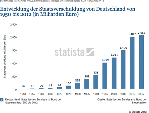 Der Spiegel rechnet vor, dass allein von Ende 2009 bis Ende 2012 die Staatsverschuldung von 1768,9 Milliarden auf 2166,3 Milliarden Euro zunahm und dieser schwarz-gelben Regierungszeit nahezu ein Fünftel der öffentlichen Schulen zu „verdanken“ sind.